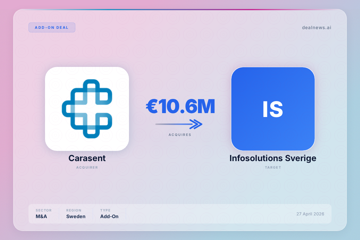 Carasent acquires Infosolutions Sverige AB for SEK 115 million, expanding EHR connectivity across Swedish healthcare. Read the full deal analysis.